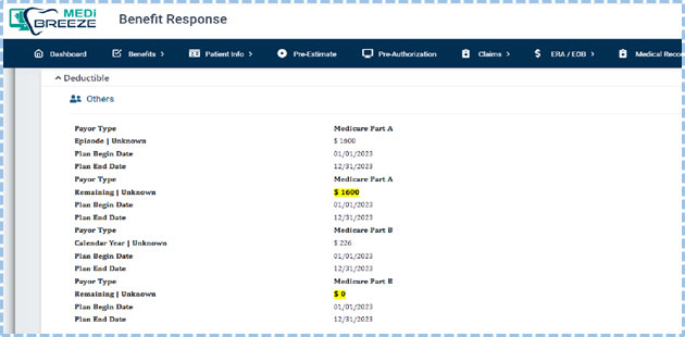 The front office needs to check the below screen for the correct deductible information for both Medicare Part A and B (Met and Remaining).