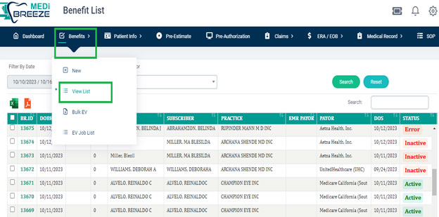 Step 4: Once you've filled in the required fields, which are highlighted in green, and clicked the submit button, you'll be directed to a screen displaying a list of patients and their existing benefits. In other words, by selecting the "view list" option, you can easily access all the eligibility information for each patient in one place, as displayed below.